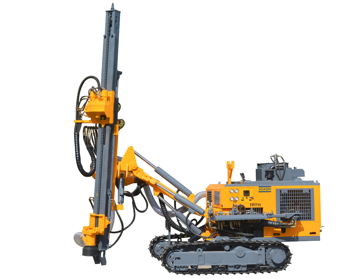 KG430/KG430H型露天潛孔鉆車(chē)是應(yīng)國(guó)家對(duì)環(huán)保要求而進(jìn)行升級(jí)的一款新設(shè)備。配備玉柴四缸國(guó)三發(fā)動(dòng)機(jī),滿足國(guó)家對(duì)排放和環(huán)保的要求。采用柱塞行走馬達(dá),折邊履帶架和工程四輪一帶,提高工作壓力,增加爬坡性能。增大俯仰和舉臂油缸,滿足極限位置使用要求。同時(shí)對(duì)液壓系統(tǒng)升級(jí),增大系統(tǒng)流量,提高回轉(zhuǎn)轉(zhuǎn)速?;剞D(zhuǎn)器采用雙馬達(dá)減速器,增大回轉(zhuǎn)扭矩和轉(zhuǎn)速。對(duì)加大提升油缸和鏈條,提高提升力和可靠性。加固導(dǎo)軌和增加滑板上下耐磨板,延長(zhǎng)使用壽命。導(dǎo)軌采用傾斜安裝,方便操作和觀察。罩殼采用加厚型材折邊,增加強(qiáng)度和剛性,增加起吊吊環(huán),方便裝卸吊裝。