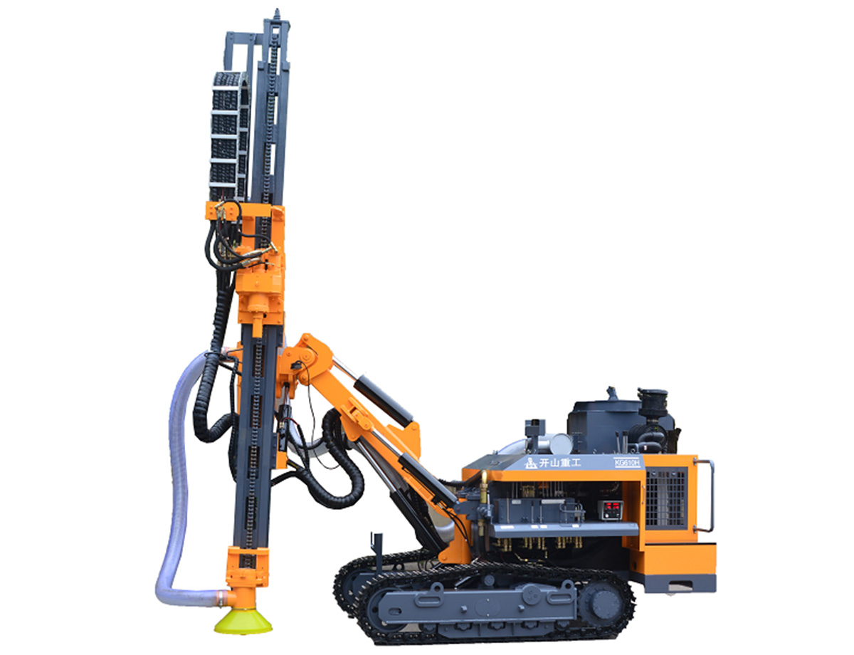 KG610/KG610H型露天潛孔鉆車是應國家對環(huán)保要求而進行升級的一款新設備。配備玉柴四缸國三發(fā)動機,滿足國家對排放和環(huán)保的要求。采用柱塞行走馬達,折邊履帶架和工程四輪一帶,提高工作壓力,增加爬坡性能。增大俯仰和舉臂油缸,滿足極限位置使用要求。同時對液壓系統升級,增大系統流量,提高回轉轉速。回轉器采用雙馬達減速器,增大回轉扭矩和轉速。對加大提升油缸和鏈條,提高提升力和可靠性。加固導軌和增加滑板上下耐磨板,延長使用壽命。導軌采用傾斜安裝,方便操作和觀察。罩殼采用加厚型材折邊,增加強度和剛性,增加起吊吊環(huán),方便裝卸吊裝。