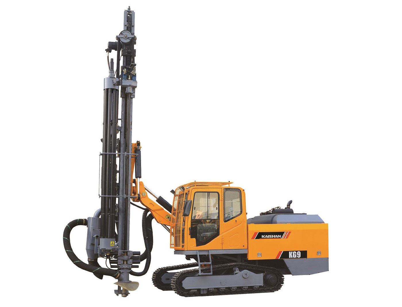 KG9型露天潛孔鉆車的行走、推進(jìn)、回轉(zhuǎn)及角度調(diào)整等動(dòng)作均采用液壓驅(qū)動(dòng),動(dòng)力強(qiáng)勁;沖擊采用高風(fēng)壓氣動(dòng)沖擊,鑿巖效率高;配有液壓干式集塵器收集粉塵,減少對(duì)環(huán)境的污染。鉆車還配有直線式接缷桿系統(tǒng)、浮動(dòng)接頭和自動(dòng)噴油裝置(保護(hù)鉆桿螺紋)、空調(diào)駕駛室(提供舒適的工作環(huán)境)、自動(dòng)控制防卡釬系統(tǒng)(減少卡鉆機(jī)率)等模塊。鉆車具有自動(dòng)化程度高、節(jié)能高效、舒適環(huán)保、操作方便、行駛安全等特點(diǎn)。