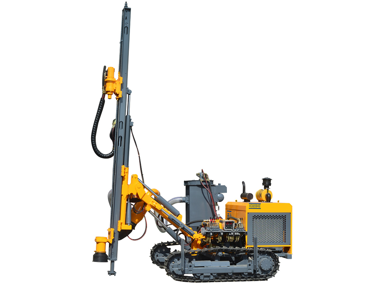 KG920BIII型露天潛孔鉆車是應國家對環(huán)保要求而進行升級的一款新設備。配備玉柴雙缸國三發(fā)動機,滿足國家對排放和環(huán)保的要求。靈活的變幅機構,可滿足鉆鑿低位水平孔功能,同時對液壓系統(tǒng)升級,增大其系統(tǒng)流量,提高回轉轉速。對提升油缸進行優(yōu)化,提高其可靠性,加固導軌和增加滑板上下耐磨板,延長使用壽命。增加起吊吊環(huán)(板),方便裝卸吊裝。