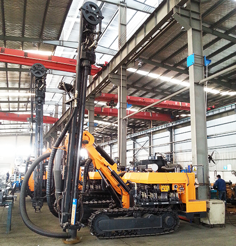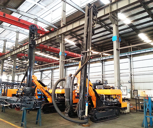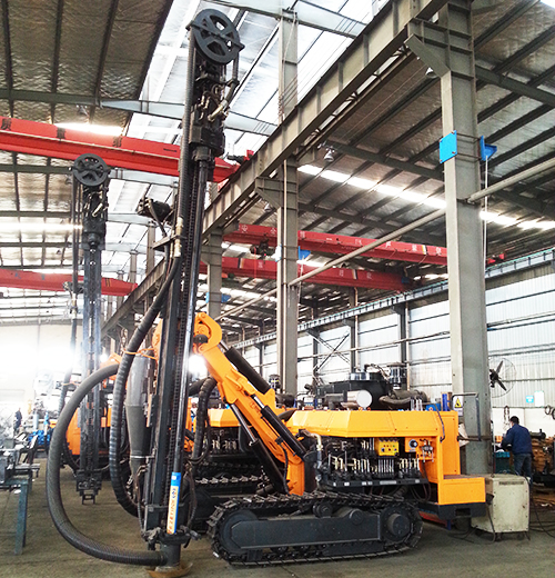 KGH8型露天潛孔鉆車是我公司根據(jù)礦山要求和運(yùn)用成熟的液壓技術(shù)而精心設(shè)計(jì)的一款自行式液壓鑿巖設(shè)備。具有外形美觀、操作方便、性能穩(wěn)定的特點(diǎn)。通過(guò)優(yōu)化的液壓元件配置,可適用不同巖層的鉆鑿孔作業(yè)。大功率四缸康明斯發(fā)動(dòng)機(jī),可適用較高海拔的鉆孔作業(yè)。大扭矩回轉(zhuǎn)減速器提供強(qiáng)勁的回轉(zhuǎn)扭矩,可滿足較大及較深孔徑的鉆鑿作業(yè)。是露天采礦、道路修建、隧道開(kāi)鑿等工程方面的理想鑿巖設(shè)備。配備的鑿巖集塵凈化器,凈化鑿巖作業(yè)環(huán)境,減少環(huán)境污染。