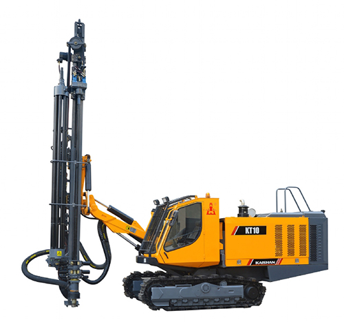 KT10型一體式潛孔鉆車以康明斯國三柴油機為單一動力,通過兩端輸出的方式同時帶動螺桿壓縮系統(tǒng)和液壓傳動系統(tǒng),可鉆鑿φ90-125mm垂直、傾斜和水平孔,主要用于露天礦山和石方工程鉆鑿爆破孔和預(yù)裂孔等。鉆車配有自動接卸桿系統(tǒng)和鉆桿潤滑模塊,可實現(xiàn)單人操作,減少礦山作業(yè)人員。鉆車主操縱動作集成在一個手柄上,操作簡單,配有防卡鉆系統(tǒng),并可選配鉆孔角度和深度指示,簡化了鉆孔過程控制并改善成孔質(zhì)量。高效的集塵系統(tǒng)、寬敞的駕駛室、大功率冷暖空調(diào)和優(yōu)質(zhì)的音響設(shè)備提供了優(yōu)質(zhì)的操作環(huán)境,最大限度提高操作人員工作效率。